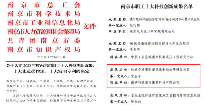 新年伊始傳捷報,2023年南京市職工十大科技創(chuàng)新成果獎評選結(jié)果揭曉,由利德東方宋亞平為第一完成人的“軌道交通用耐超低溫制動軟管研發(fā)項目”獲評南京市職工十大科技創(chuàng)新成果,第一完成人宋亞平被授予“南京市技術(shù)能手”榮獲稱號。這是對該項目和個人在科技創(chuàng)新領(lǐng)域所取得的突出成果和貢獻的高度認可。